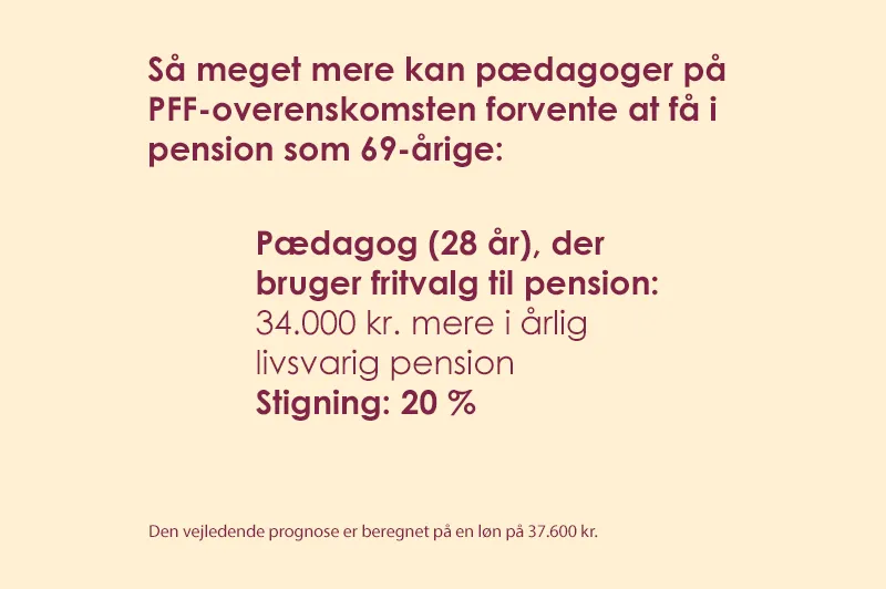 Vi har også lavet et par eksempler med beregninger, der giver dig et billede af, hvor meget mere du kan forvente at få i pension, hvis du er på enten pædagogoverenskomsten, PFF-overenskomsten eller lederoverenskomsten.